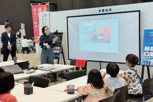 赤鹿地所のブースには多くの子どもたちが訪れ、お客様に最適な賃貸物件を紹介する「不動産アドバイザー」の仕事に熱心に取り組みました。